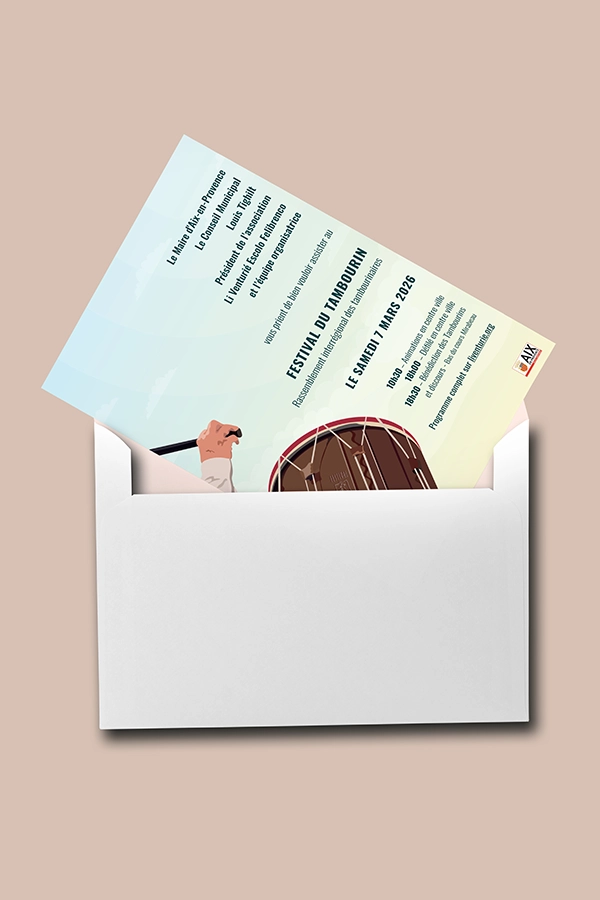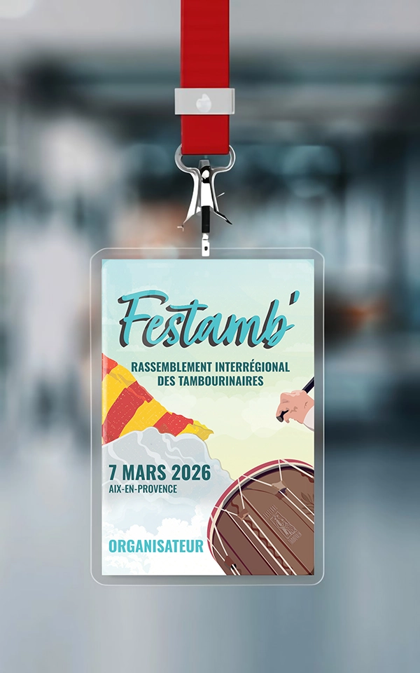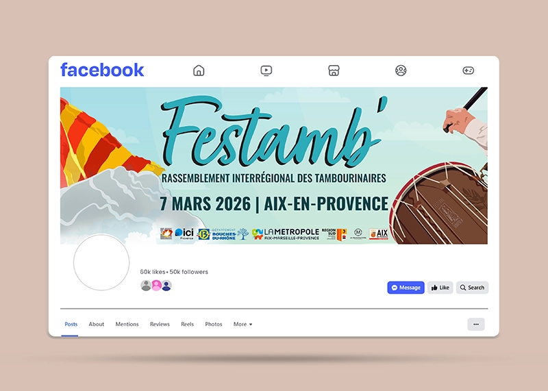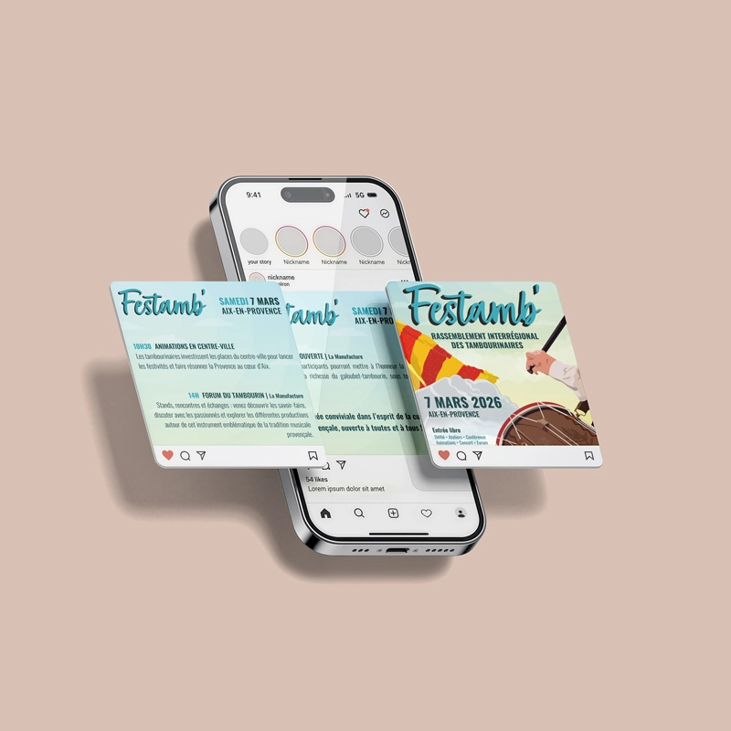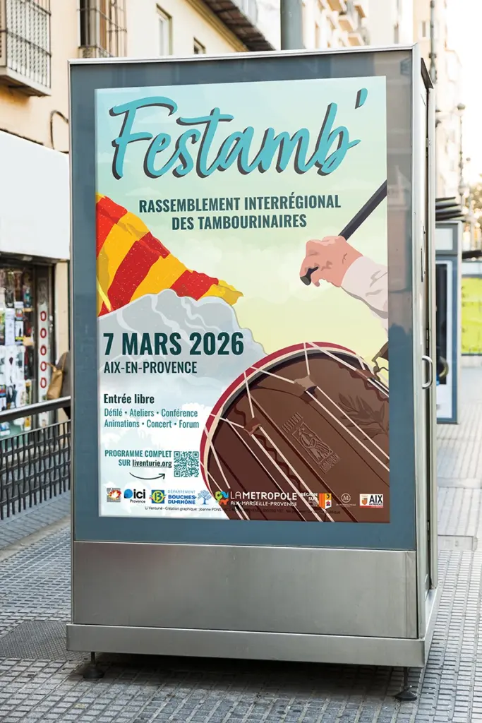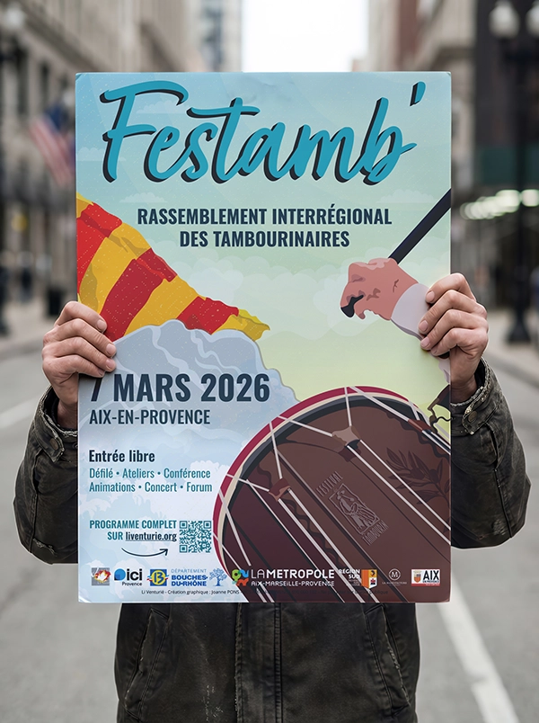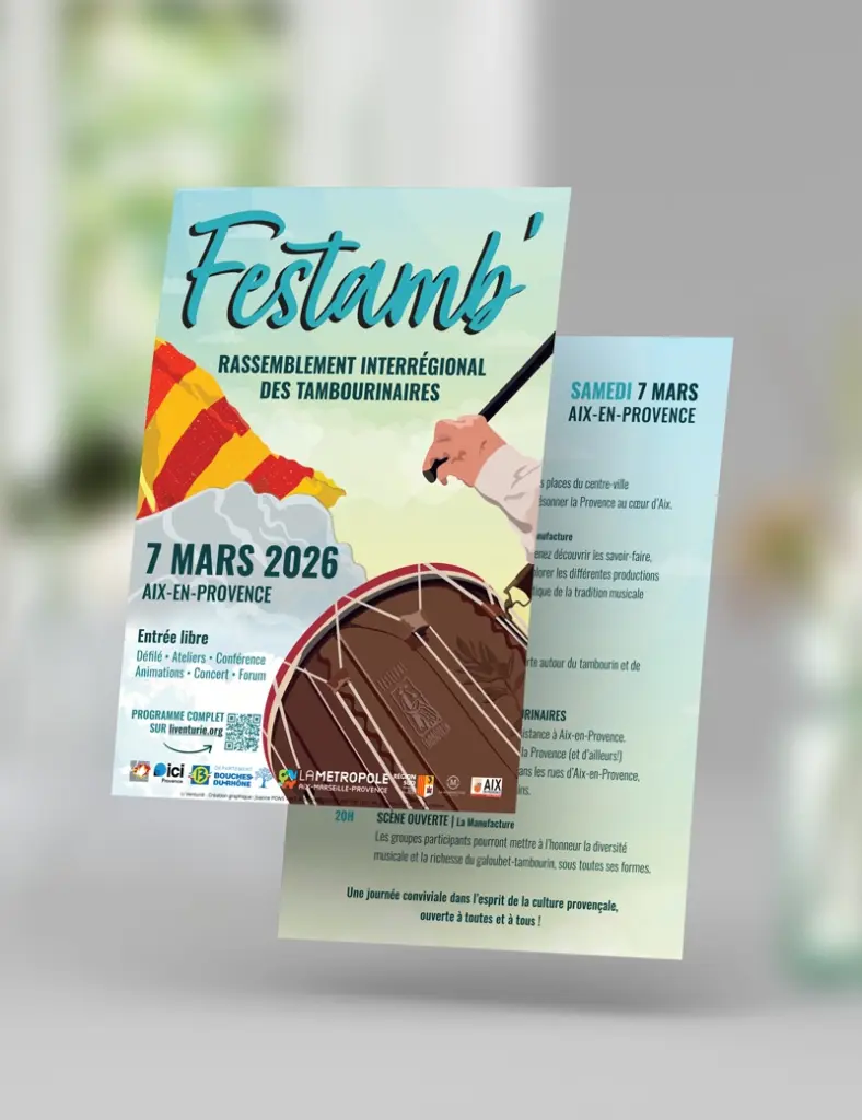 Depuis 34 ans, Festamb’ rassemble les tambourinaires afin de promouvoir les instruments et la musique provençale. L’événement se déploie à travers de nombreux concerts ainsi qu’un grand rassemblement défilant dans les rues d’Aix-en-Provence. Pour l’édition 2026, l’enjeu était de concevoir une identité visuelle capable de traduire l’esprit festif et culturel du rendez-vous, tout en assurant une déclinaison cohérente sur des supports imprimés et numériques.